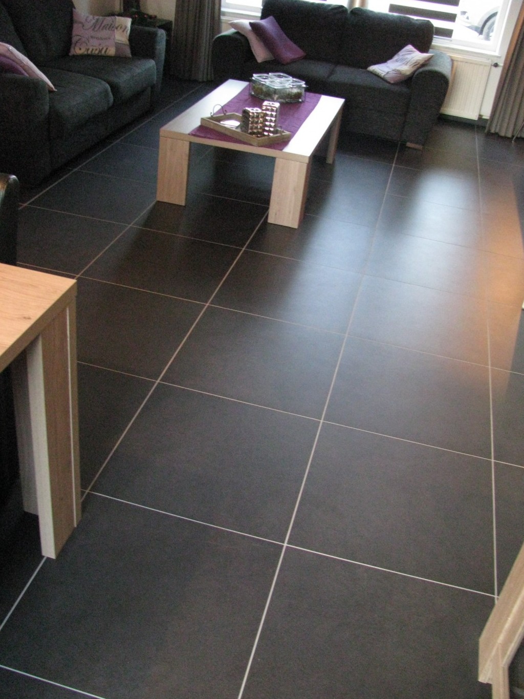 Op de gehele benedenverdieping is de vloertegel Living or. Black nat. gebruikt, 60x60x1 cm (niet meer leverbaar).