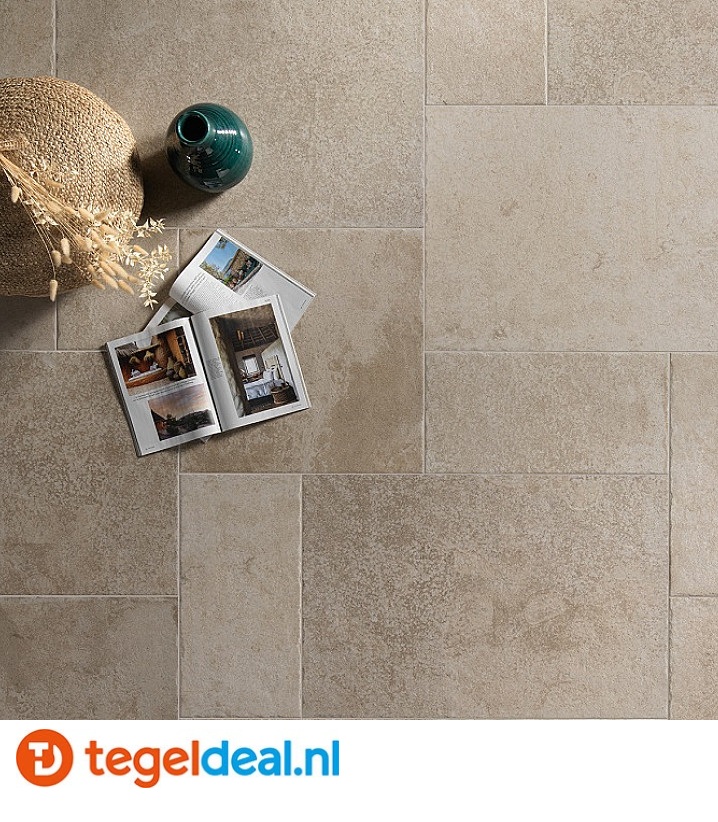 Op de vloer in deze woonkamer ziet u de tegels van het Italiaanse merk Class Tile by Galileo, serie Castle Stone in de kleur Beige en het formaat 60x90 cm.